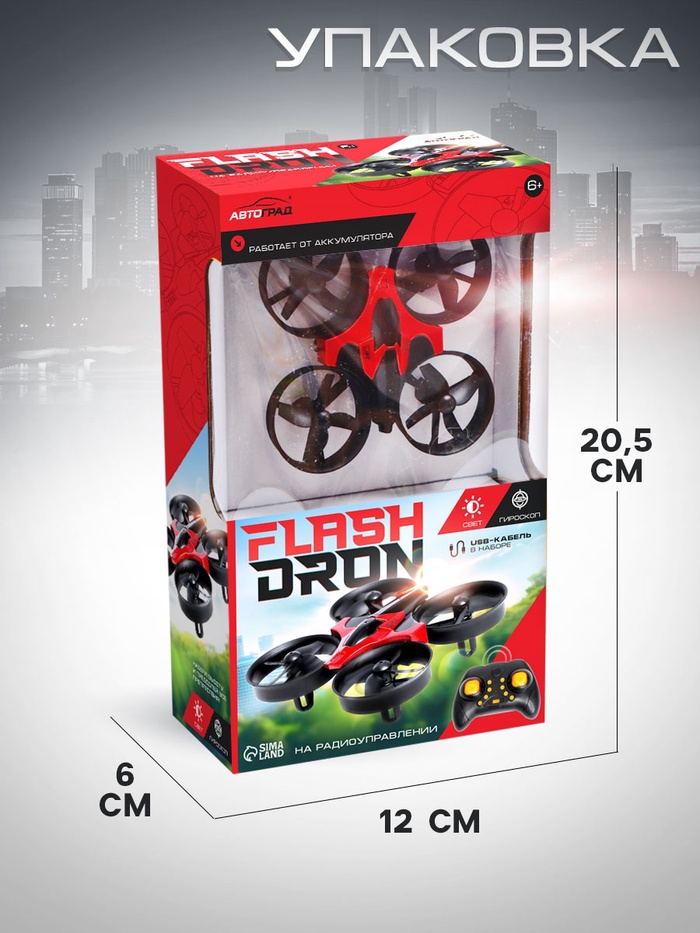 - Flashdrone работает от аккумулятора, пульт управления — от 3 батареек типа AAA (не входят в комплект).