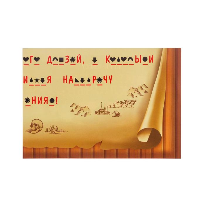 Игрокам предстоит почувствовать себя настоящими искателями сокровищ и выполнить множество заданий. Это и ребусы, и задания на внимание, и загадки, и головоломки… Чего здесь только нет! Правильно разгадывая все шифры, дети найдут кусочки карты, которая и приведёт их к заветной цели.