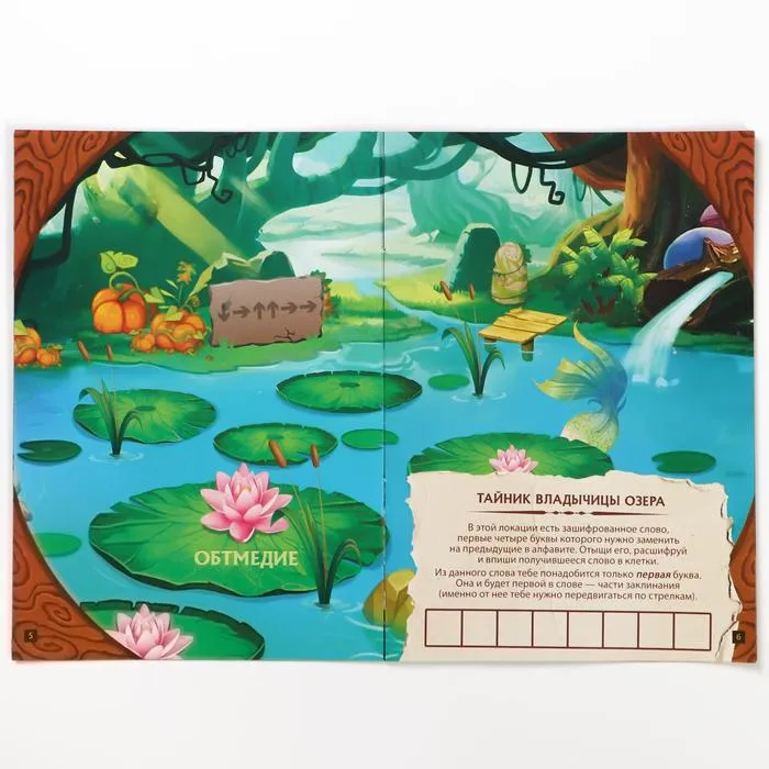 На всех разворотах книги расположены локации страны магии. На каждой из них нужно отыскать артефакт, который поможет разгадать одно из четырёх слов заклинания в книге магии.