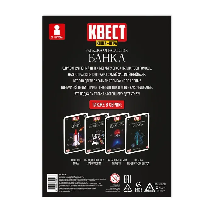 Квест книга-игра «Загадка ограбления банка», 26 страниц, 7+ — Характеристики