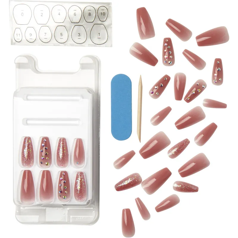 В комплект входит 28 ногтей coffin-формы, 2 г клея для ногтей, клейкие полоски, пилочка для ногтей и апельсиновая палочка. Вы всегда можете полагаться на обновленную информацию о продукте на упаковке.