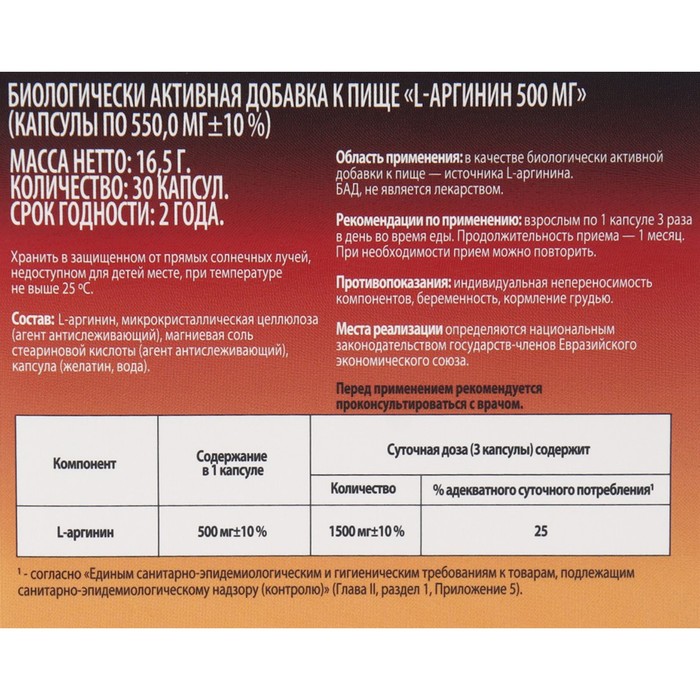 L-аргинин 500 мг - это добавка к питанию, которая содержит аминокислоту L-аргинин, необходимую для правильного функционирования иммунной и сердечно-сосудистой системы. Каждая капсула массой 550 мг содержит 500 мг L-аргинина и добавки для облегчения его усвоения. В упаковке 30 капсул. Этот продукт может быть особенно полезен для людей, занимающихся физической активностью, а также для тех, кто хочет поддерживать здоровое сердце и сосуды. Л-аргинин может также помочь уменьшить уровень стресса и повысить энергию и выносливость. Рекомендуется принимать по 1 капсуле в день во время еды в качестве дополнения к питанию.