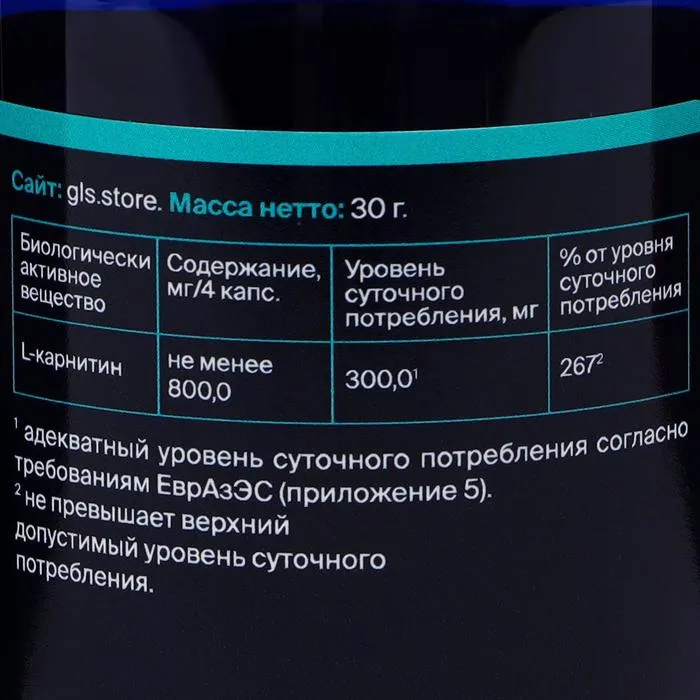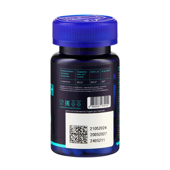 4 капсулы (суточная доза) содержат: L-карнитин — 800 мг.