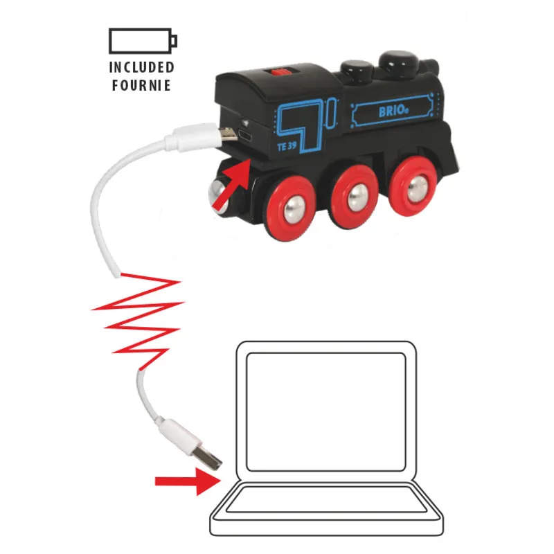 Brio Перезаряжаемый поезд с USB-кабелем 33599 приносит на рельсы что-то новое и особенное! Этот черный поезд, напоминающий классический паровоз, легко заряжается с помощью USB-кабеля. Вы можете заряжать его от ноутбука, телефона или планшета где угодно. Фара на передней части поезда освещает дорогу и предупреждает о приближении транспорта.