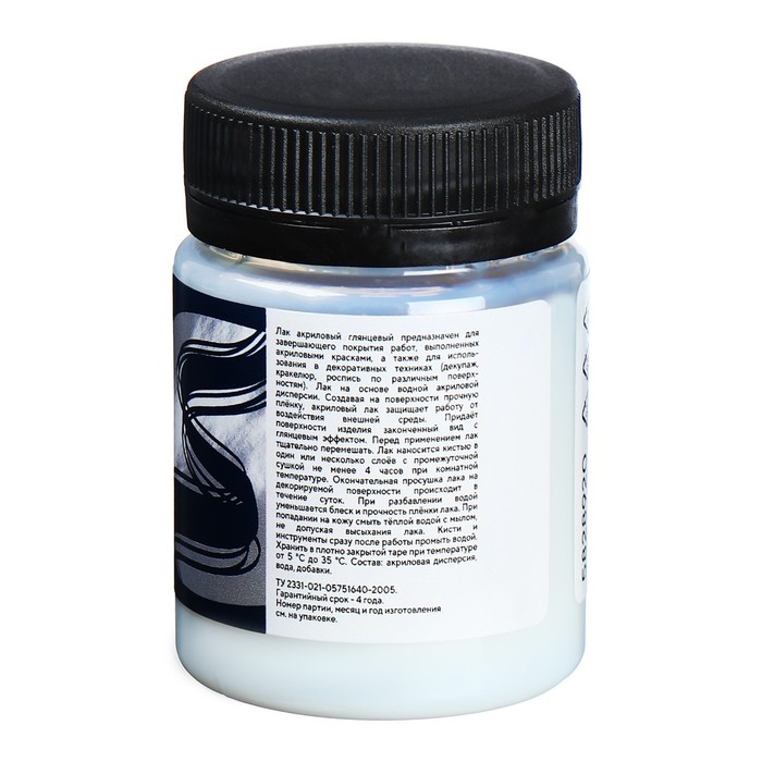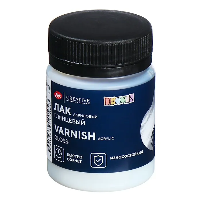 Лак акриловый, глянцевый, 50 мл. На основе водной акриловой дисперсии. Предназначен для завершающего покрытия работ, выполненных акриловыми красками, а также для использования в декоративных техниках (декупаж, кракелюр, роспись по различным поверхностям). Создавая на поверхности прочную пленку, акриловый лак «Decola» защищает работу от воздействий внешней среды. Придает поверхности изделия законченный вид с глянцевым эффектом.