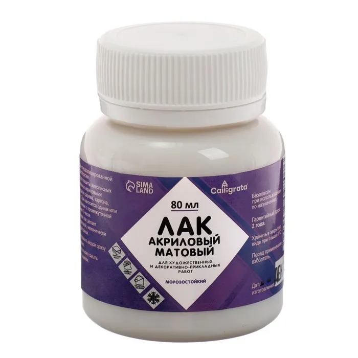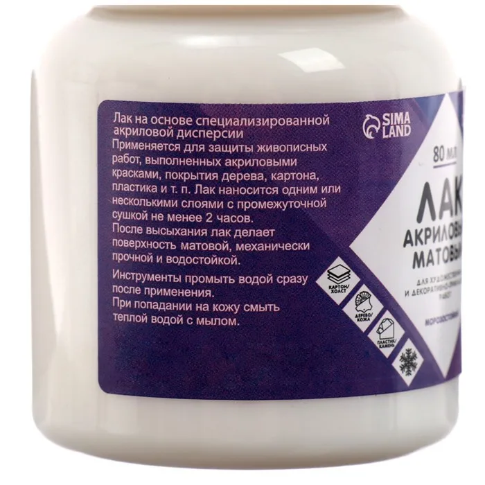 Акриловый лак применяется для защиты живописных работ, которые выполнены акриловыми красками, на дереве, картоне пластике и т.п. Лак наносится одним или несколькими слоями с промежуточной сушкой не менее 2-х часов.