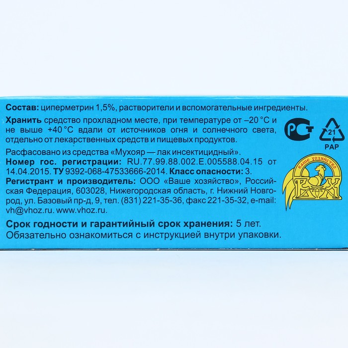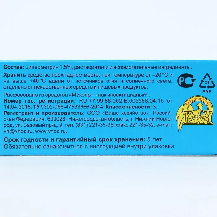 Хранить средство в прохладном месте, при температуре от -20°С и не выше +40°С вдали от источников огня и солнечного света, отдельно от лекарственных средств и пищевых продуктов. Срок годности 5 лет.