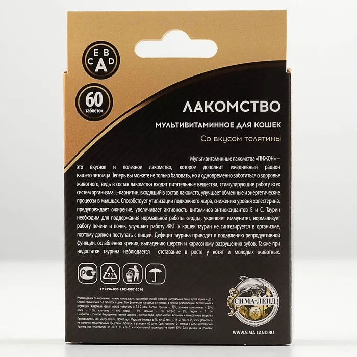Лакомство для кошек "Пижон. Здоровье и энергия" со вкусом телятины, 60 таб — Характеристики