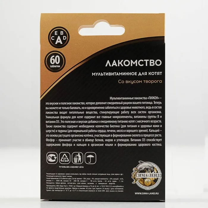 Лакомство для котят "Пижон. Здоровый малыш" со вкусом творога, 60 таб — Характеристики
