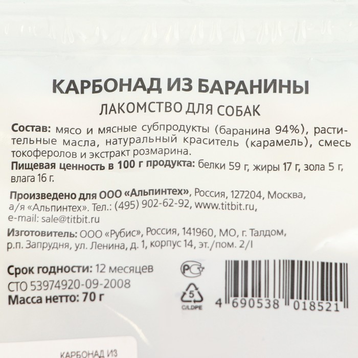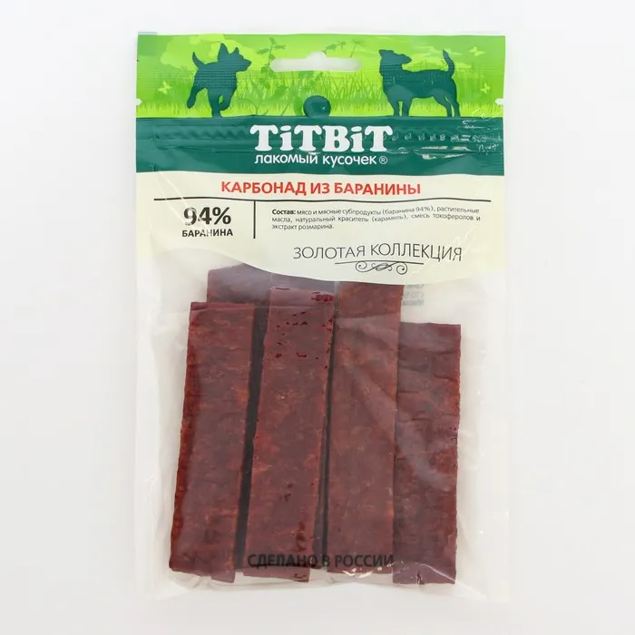 Золотая коллекция – это линейка лучших лакомств TITBIT, разработанных при участии владельцев домашних животных и их питомцев. Карбонад из баранины - это мясной деликатес, который, благодаря высокому содержанию мяса (94%) и бережной технологии приготовления, имеет привлекательный внешний вид, невероятный вкус и нежную текстуру. Баранина, входящая в основу лакомства, обогащает организм высококачественным животным белком и минералами. Ни один гурман не сможет устоять перед таким деликатесом.