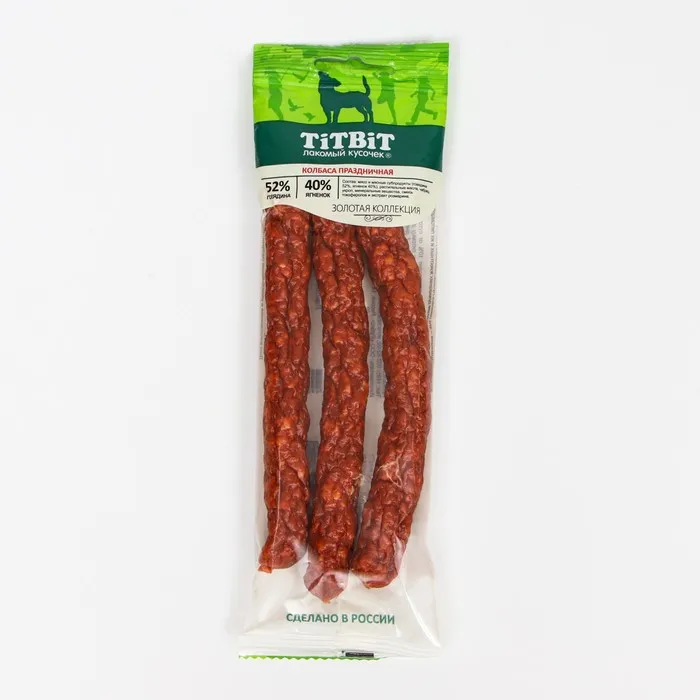 Золотая коллекция – это линейка лучших лакомств TITBIT, разработанных при участии владельцев домашних животных и их питомцев. Колбаса «Праздничная» считается элитой среди колбас для собак и излюбленным угощением четвероногих. Тщательно отобранная говядина с добавлением мяса ягненка лучшее угощение не только по особым случаям.