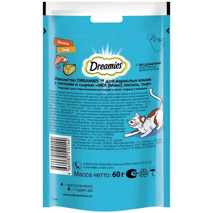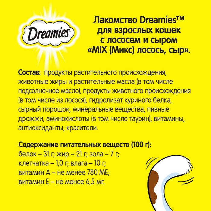 Лакомство Dreamies для кошек, лосось/сыр, 60 г — Характеристики