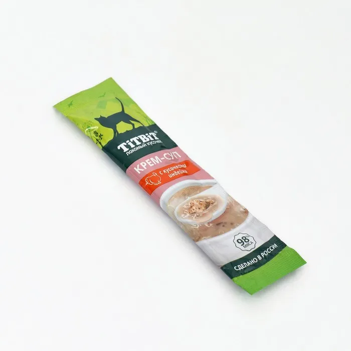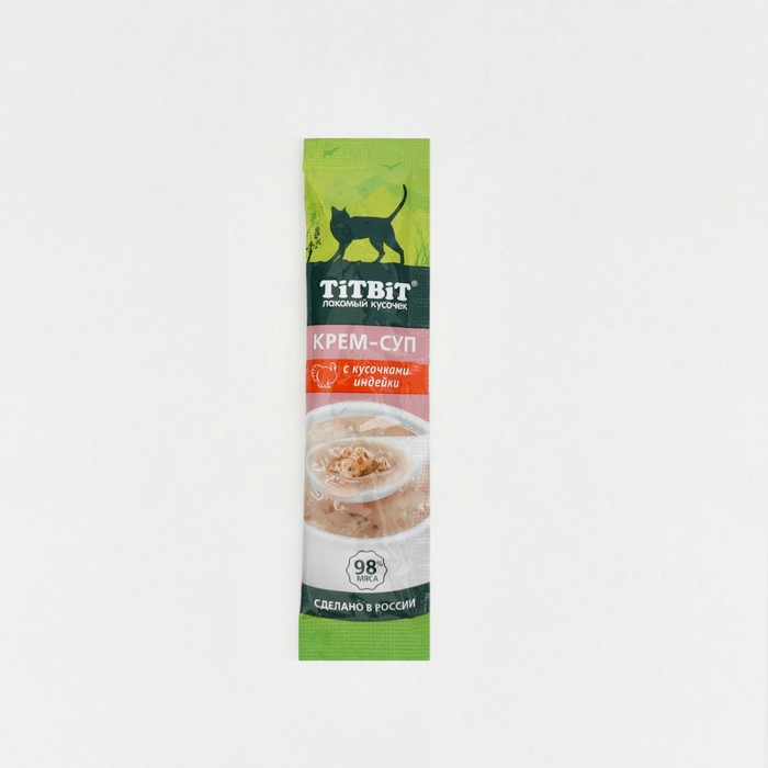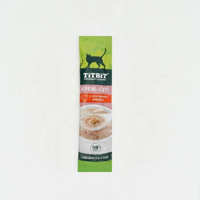 Крем-суп для кошек TITBIT с индейкой – это специально разработанные вкусные и полезные продукты, которые: 1. Содержат кусочки свежего мяса; 2. Содержат 98% мясных ингредиентов; 3. Содержат дополнительные полезные ингредиенты (таурин для поддержки зрения, сердца, пищеварительной, половой и иммунной систем; морковь для поддержки зрения и пищеварения; петрушка для поддержки мочеполовой, сердечно-сосудистой и пищеварительной систем).