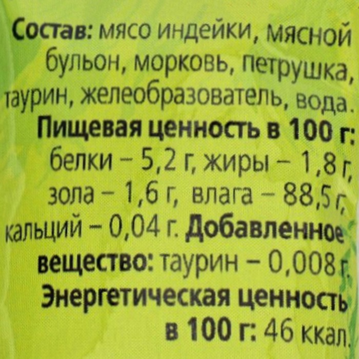 Состав: Мясо индейки, мясной, бульон, морковь, петрушка, таурин, желеобразователь, вода.