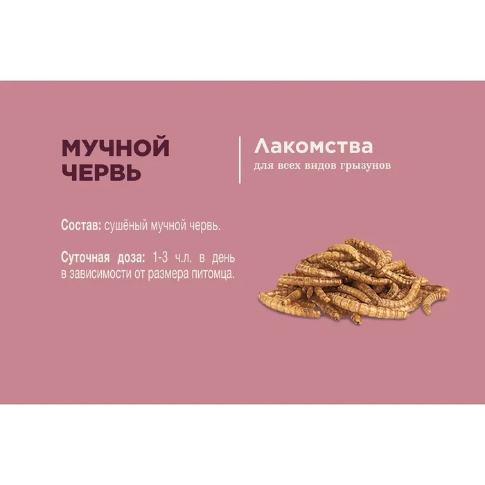 Лакомство Little One "Мучной червь" для всеядных грызунов - сушеный мучной червь является питательным дополнительным кормом для всеядных грызунов. Он представляет собой не только их излюбленное лакомство, но и ценный источник необходимого им животного белка. Его добавление позволит внести разнообразие в рацион питомца.