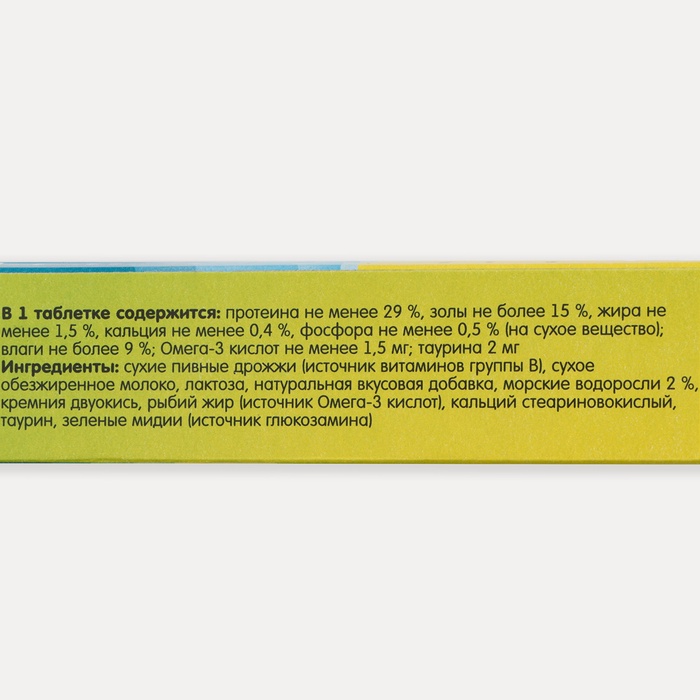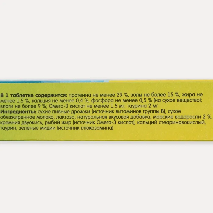 В 1 таблетке содержится: белки 33%, жиры 4%, зольные компоненты, не менее 14%, влага, не более 9%, кальций, не менее 4,1%, фосфор, не менее 1,9%, морские водоросли 2 %, таурин 45 мкг; этиловые эфиры незаменимых жирных кислот класса Омега-3, не менее 1,5 мг.
