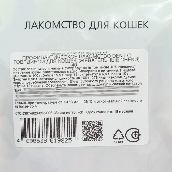 Профилактическое лакомство Dent с говядиной для кошек - это жевательный снек для Вашего четвероногого друга, необходимый для снятия мягкого зубного налёта, снижения уровня зубного камня и массажа дёсен за счет специально разработанной формы и текстуры, используется в качестве лакомства и поощрения.