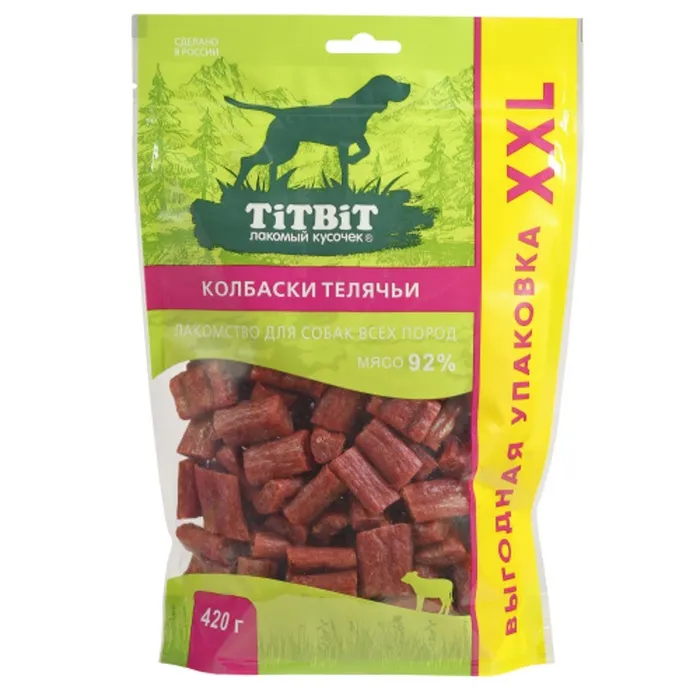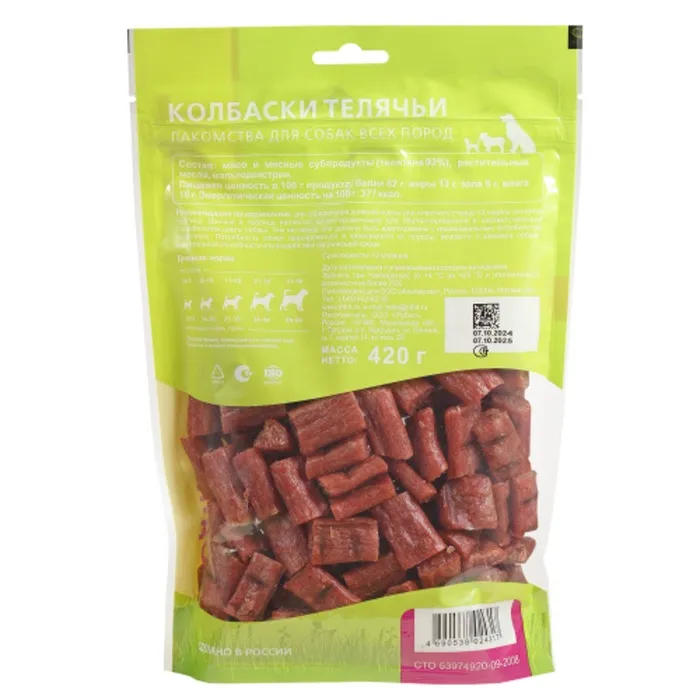 Колбаски телячьи - это аппетитное угощение для собак всех пород. Благодаря высокому содержанию мяса (92%) и бережной технологии приготовления, имеет привлекательный внешний вид и вкус. Мясо и мясные субпродукты, входящие в основу колбасок, являются превосходным источником высококачественного животного белка, витаминов и минералов. Выгодная XXL упаковка с удобным замком zip-lock сохранит лакомство и продлит удовольствие Вашего любимца.
