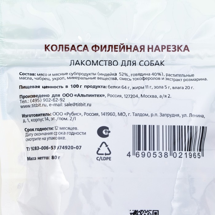 Колбасный двор для собак TitBit – это высококачественные мясные деликатесы, которые отлично подходят в качестве поощрения животного или просто побаловать своего любимца. Содержание мяса и мясных субпродуктов 92%. Не содержат соль и искусственных компонентов. Единственные мясные колбасы, представленные в виде нарезки!
