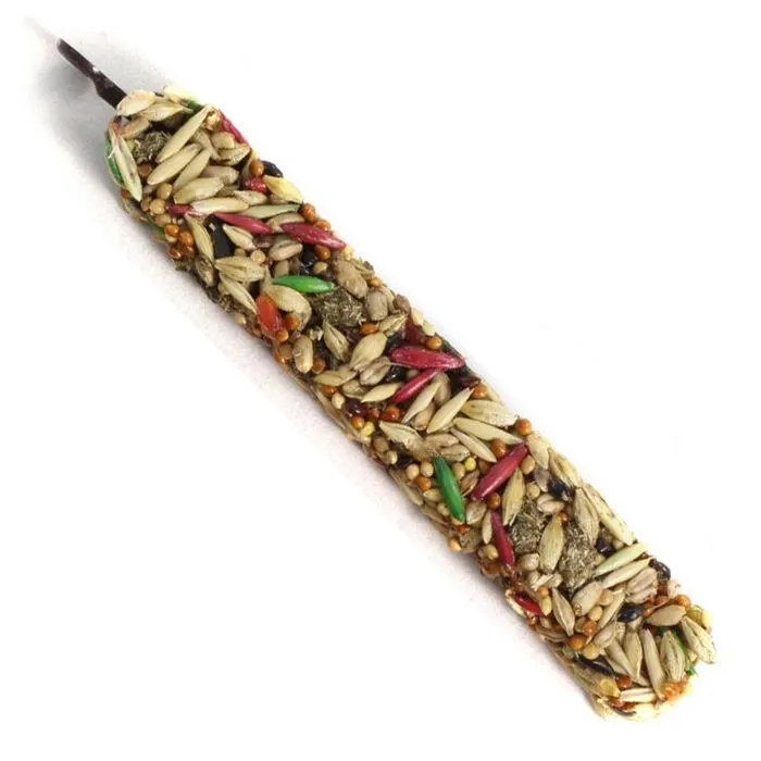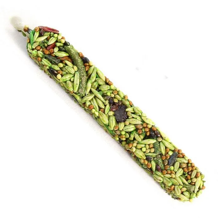 Каждая палочка упакована в индивидуальный полиэтиленовый пакет. У каждой есть специальное крючок, чтобы повесить лакомство в клетке.