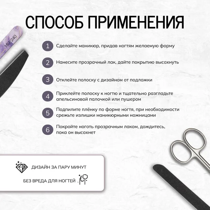 - Подпилите наклейку по форме ногтя, при необходимости срежьте излишки маникюрными ножницами.