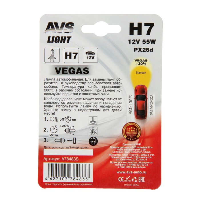 Лампы автомобильные AVS Vegas типа H7 разработаны для применения в фарах ближнего и дальнего света и обеспечивают яркое, четкое освещение, способствующее улучшению видимости на дороге при любых погодных условиях и времени суток. Данные галогеновые лампы работают от напряжения 12 вольт и имеют мощность в 55 ватт, что полностью соответствует требованиям производителей автомобилей.