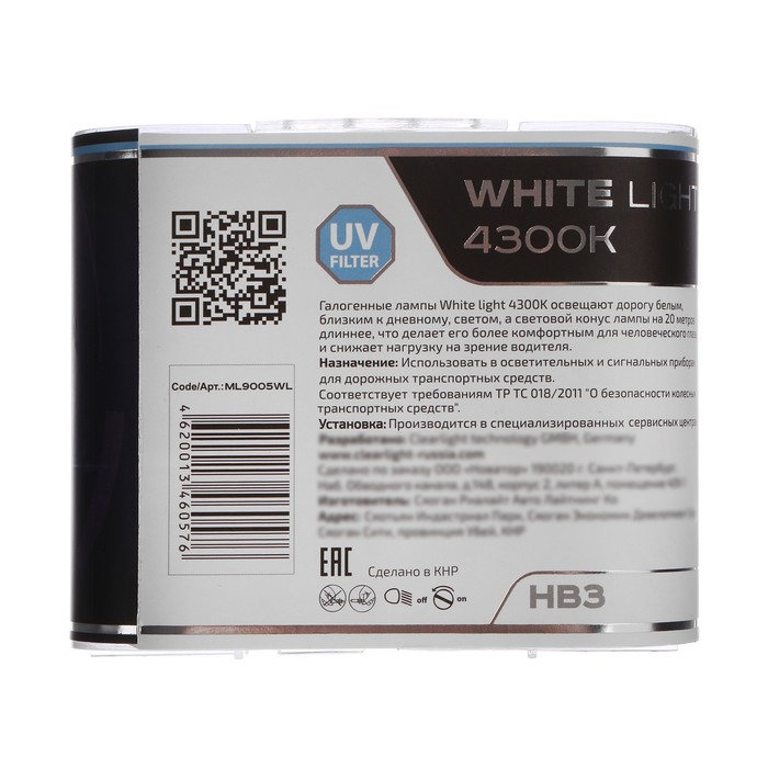 Галогенная лампа ClearLight WhiteLight имеет эффект ксенонового света с цветовой температурой в 4300 кельвинов. Whitelight являются отличной заменой штатных ламп накаливания благодаря своим преимуществам. Галогенные лампы ClearLight WhiteLight обладают мощным белым светом и разработаны для водителей, которым необходимо яркое освещение на дороге и важен индивидуальный стиль. ClearLight WhiteLight широко применяется для фар ближнего, дальнего света и противотуманного света. Высококачественное кварцевое стекло с уникальным голубоватым покрытием ламп серии WhiteLight производимых по немецким технологиям обеспечат полную безопасность на дороге.