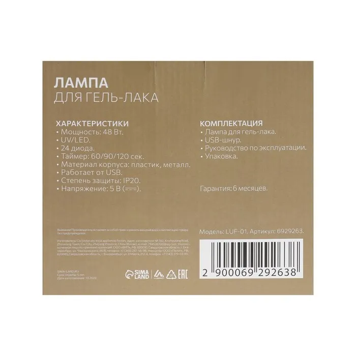 Лампа для маникюра Luazon LUF-01, UV/LED, 24 диода, 48 Вт, таймер, USB, белая — Характеристики