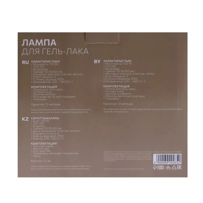 Лампа для маникюра Luazon LUF-03, UV/LED, 45 диодов, 120 Вт, таймер, 220 В, белая — Характеристики