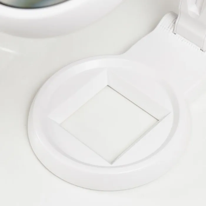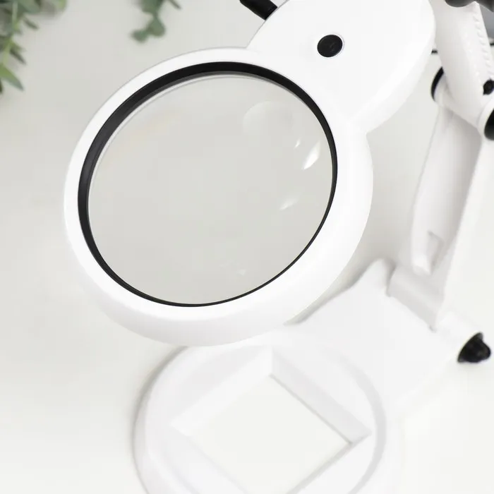 - Лупа с регулируемым увеличением: Оптическая линза даёт увеличение от 2x до 20x. Диаметр рабочей зоны — 105 мм. Чёткое изображение без искажений помогает видеть мельчайшие элементы — будь то стежок, деталь схемы или капля лака.