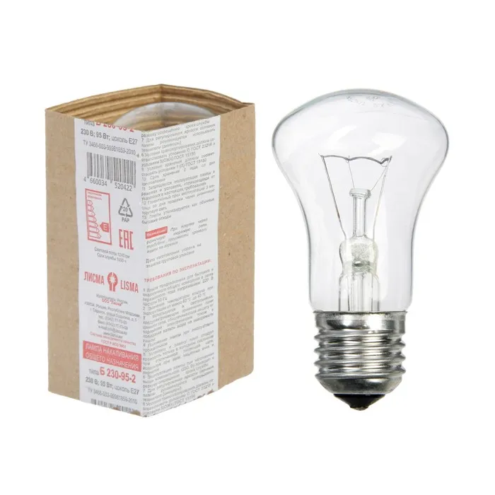 Лампа накаливания "Лисма", Б, Е27, 95 Вт, 230 В