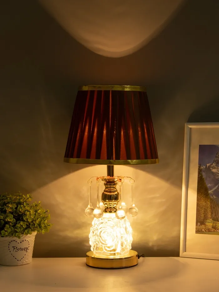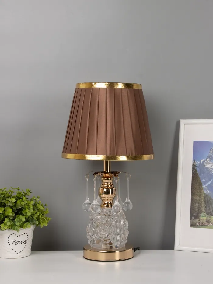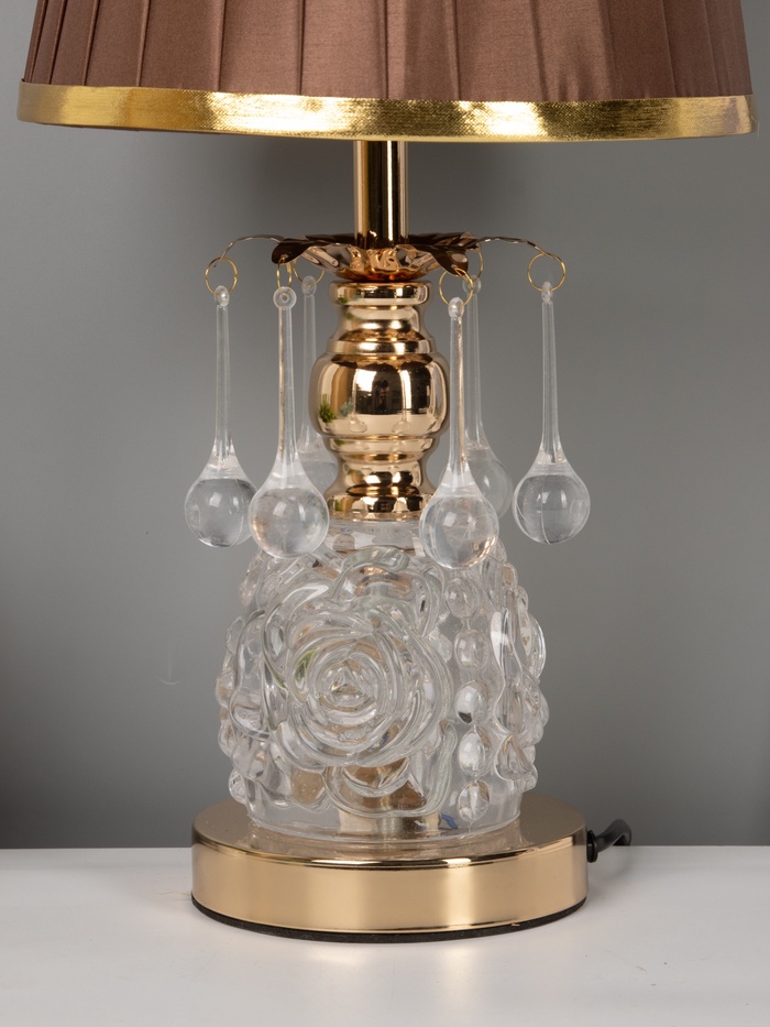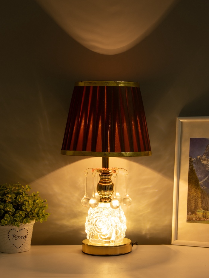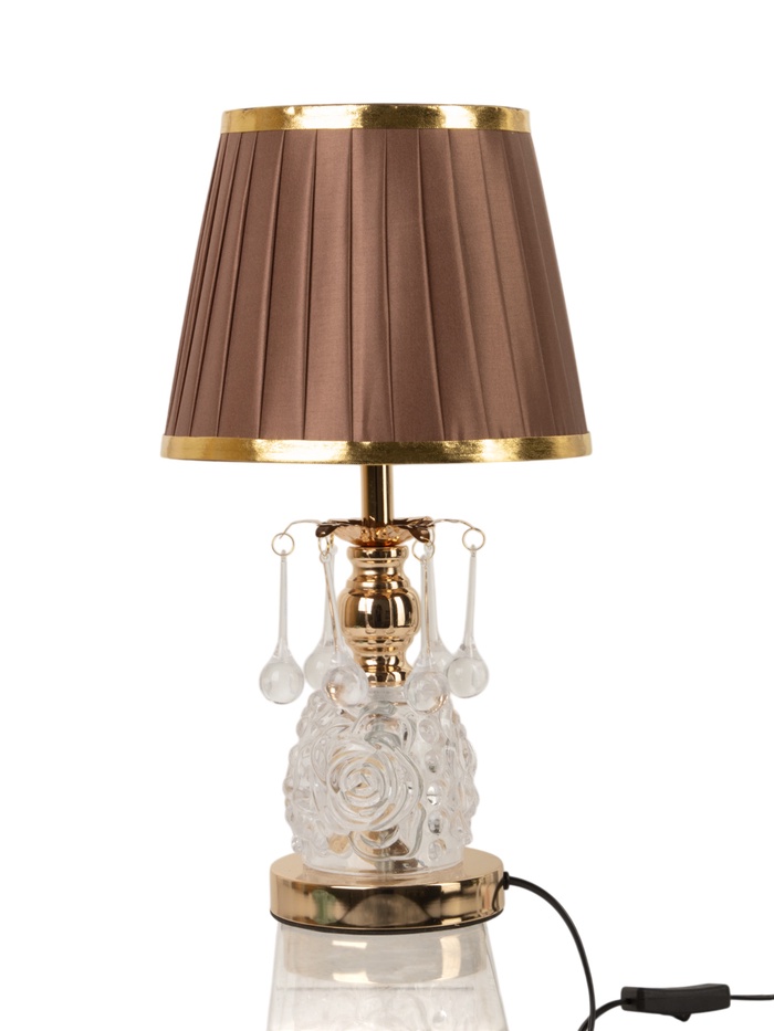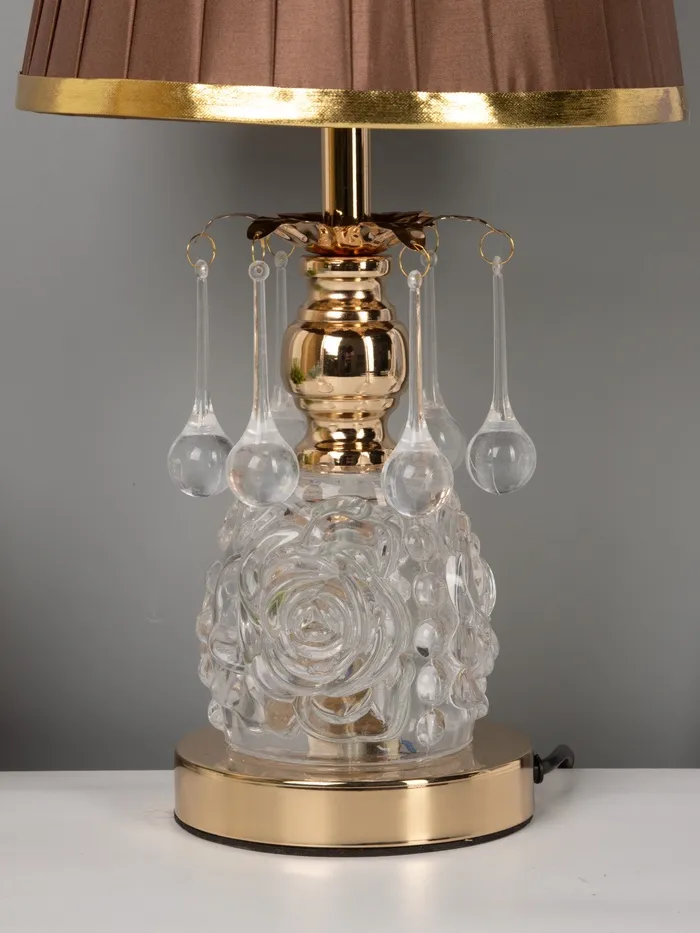 - Роскошь в деталях: Золотистое металлическое основание и вставки из стекла придают лампе благородный вид. Такой оттенок добавляет интерьеру лёгкой роскоши, не перегружая пространство.