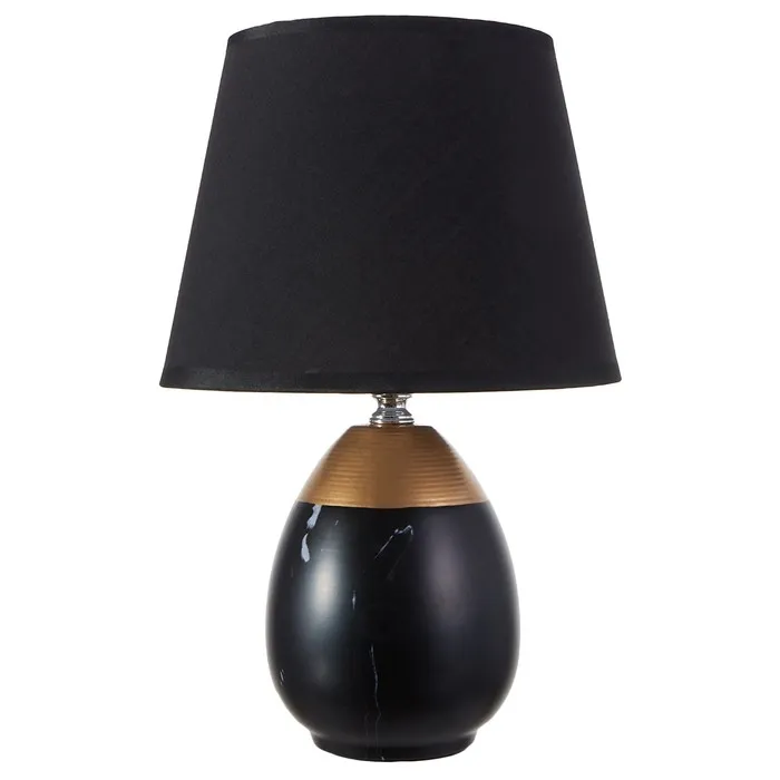 Эта настольная лампа станет стильным акцентом в вашем интерьере, добавляя нотку элегантности и уюта. С высотой 31 см и размерами 20×20 см, она прекрасно впишется в любое пространство — от рабочего стола до прикроватной тумбы. Золотое и черное керамическое основание в сочетании с текстильным абажуром темных тонов создают атмосферу современности и классики.