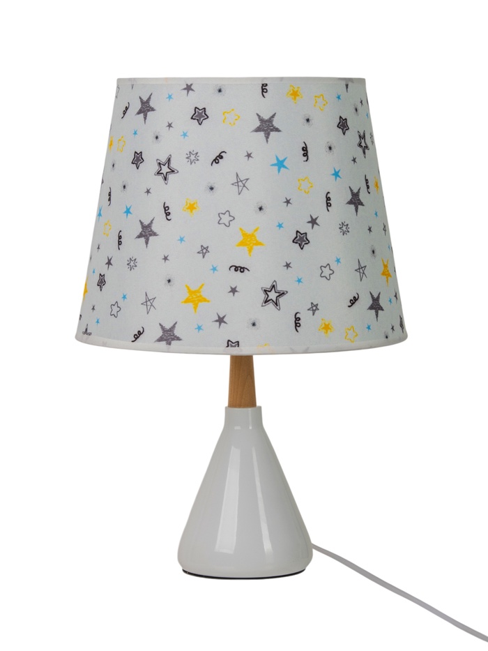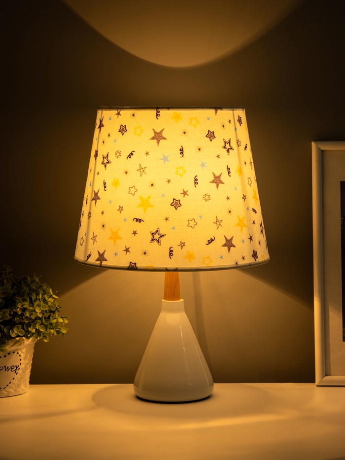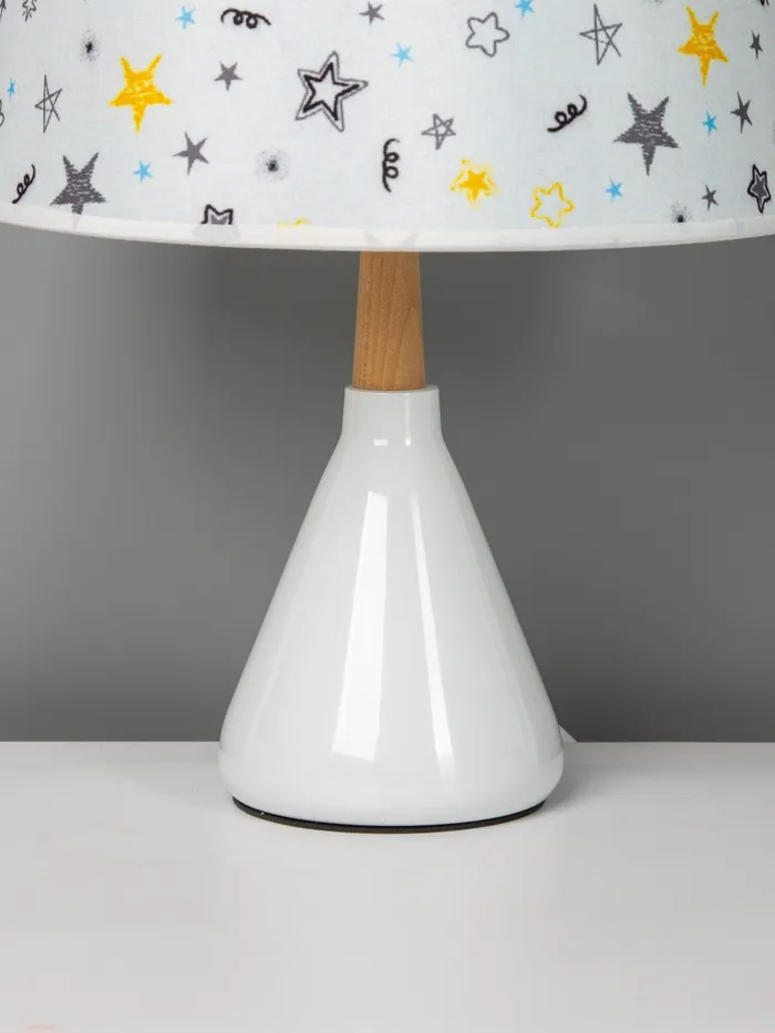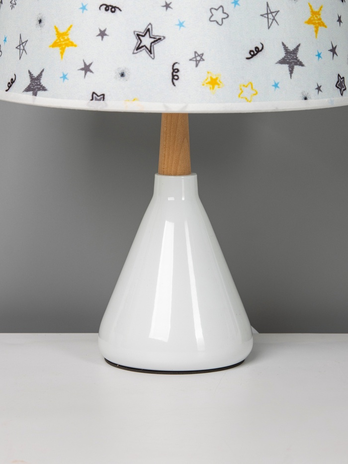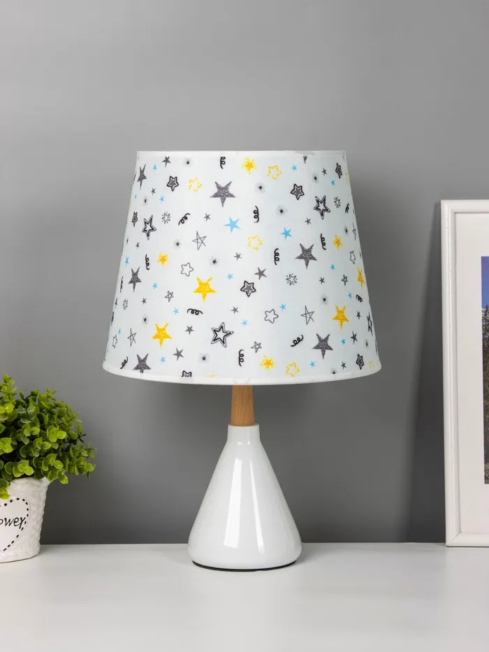 - Дизайн с характером: Керамическое основание белого цвета — прочное и устойчивое. Разноцветный цилиндрический абажур становится акцентом на столе, добавляя яркости без кричащих деталей. Подходит для детской, спальни или гостиной в стиле прованс, скандинавского минимализма или винтажа.
