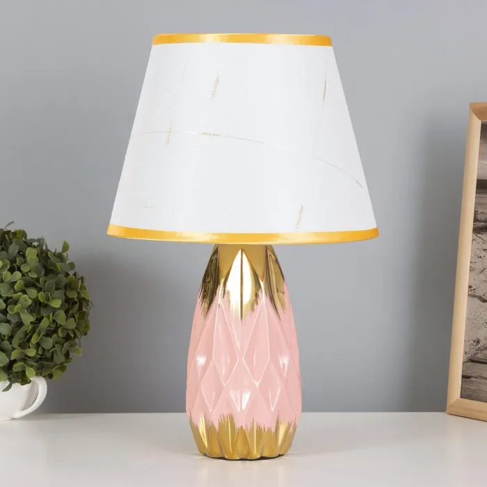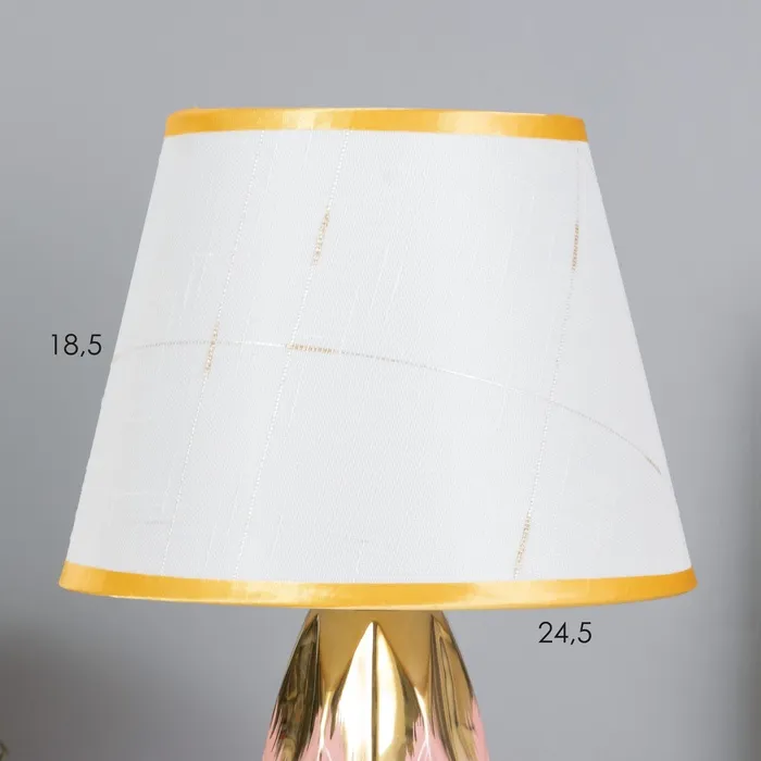 Эта настольная лампа станет стильным дополнением вашего интерьера, придавая ему изысканный вид. Сочетание розового и золотого оттенков в керамическом основании и текстильном абажуре создаёт гармоничное освещение, подходящее для различных пространств.