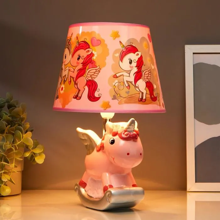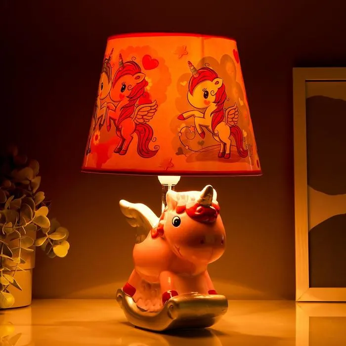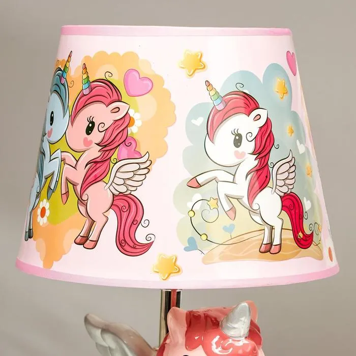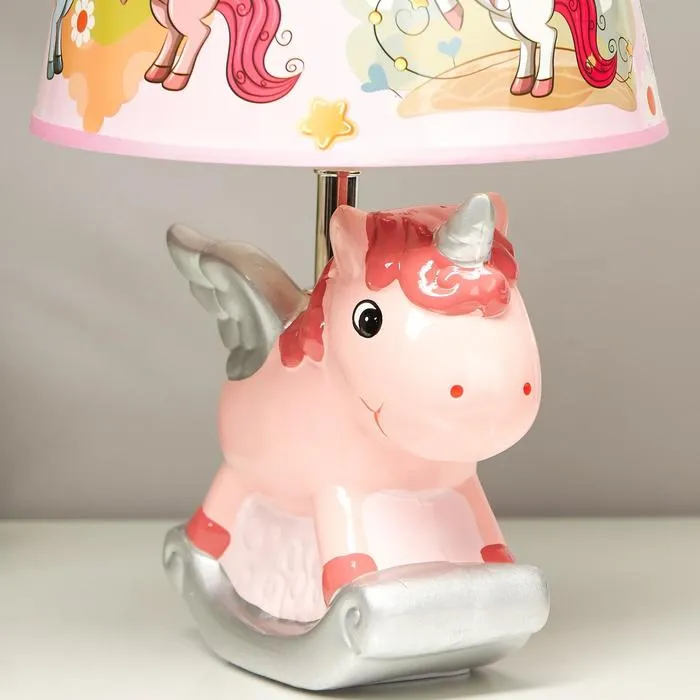 Декоративная лампа «Единорог» с абажуром из плотного картона украсит интерьер детской комнаты. Яркая фигурка изготовлена из керамики. Имеет размеры: 32 × 20 × 20 см.