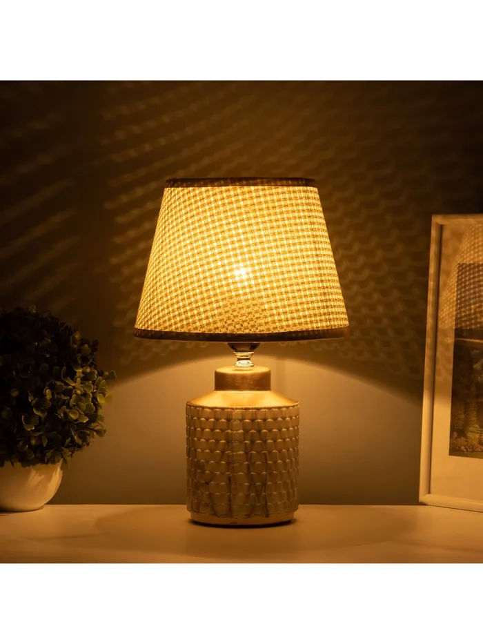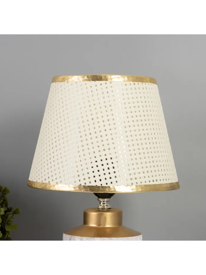 Элегантная настольная лампа с керамическим основанием в бело-золотых тонах станет изысканным акцентом в вашем интерьере. Абажур из текстиля и пластика дополняет образ, создавая мягкое и уютное освещение.