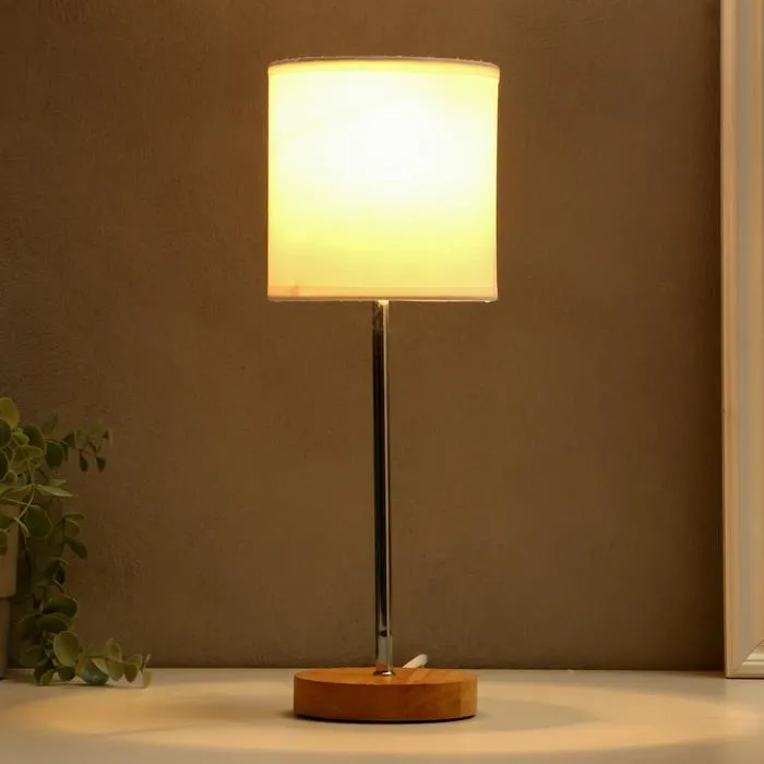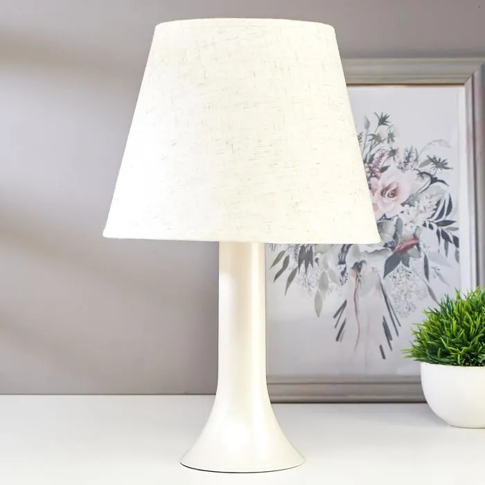 - Белое пластиковое основание гармонично сочетается с абажуром, добавляя лампе изысканности.