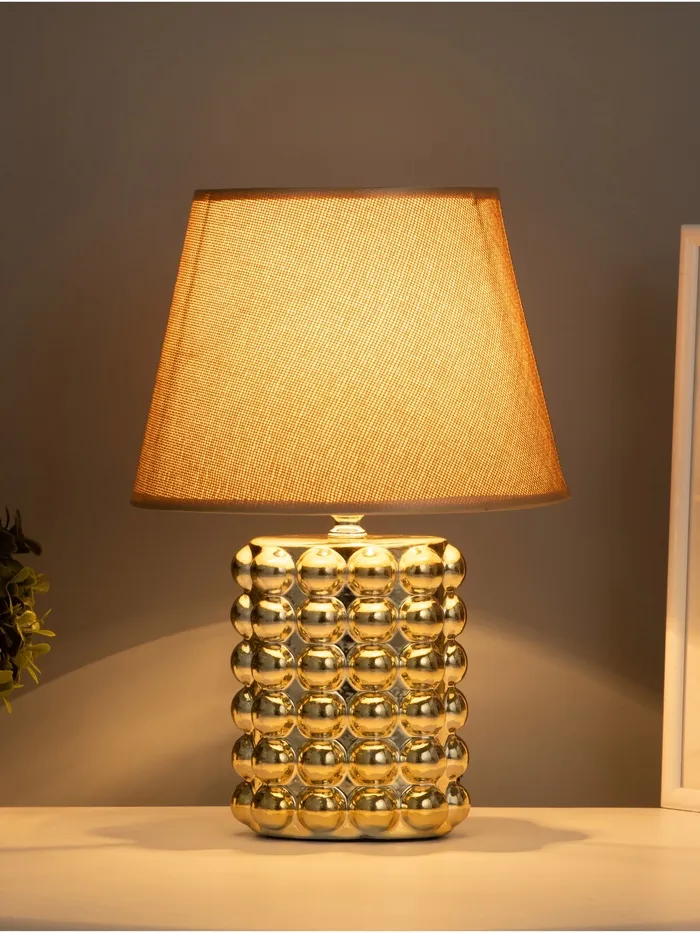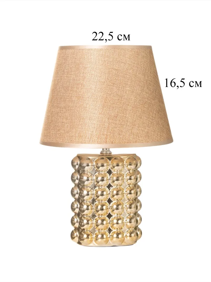 - Золотистая керамическая основа и текстильно-пластмассовый абажур придают лампе утончённый и изысканный вид, который подчеркнёт вашу любовь к стилю и красоте.