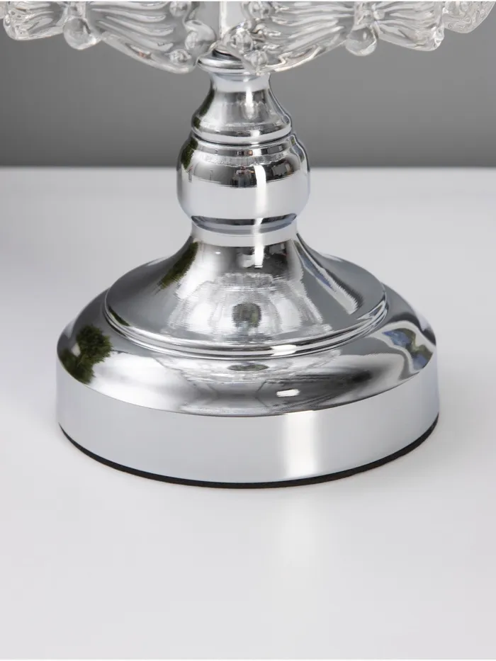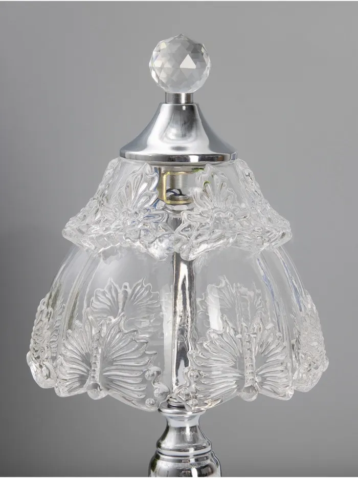 Лампа с хрустальным абажуром идеально подходит для классических и современных интерьеров. Дизайн с гравировкой и хрустальными деталями из акрила привлекает внимание и добавляет изысканности в любое пространство. Компактные размеры позволяют разместить лампу на прикроватной тумбочке, рабочем столе или полке.