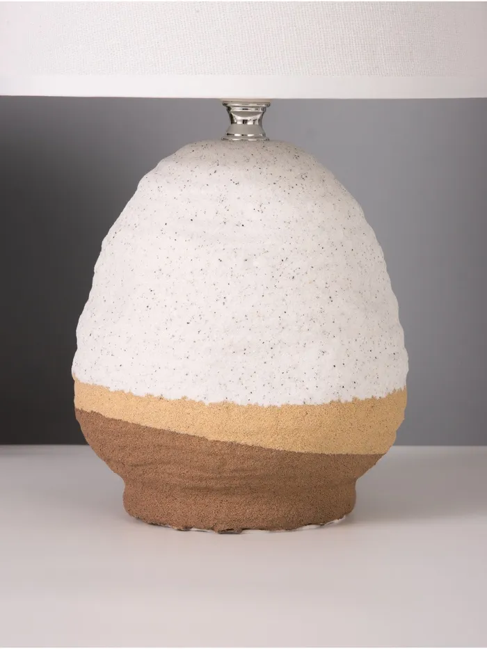 - Уникальный дизайн: Основание лампы выполнено в виде абстрактной скульптуры с плавными изгибами и переходами между белым и коричневым цветами. Это придает лампе художественную выразительность и делает её центральным элементом декора.