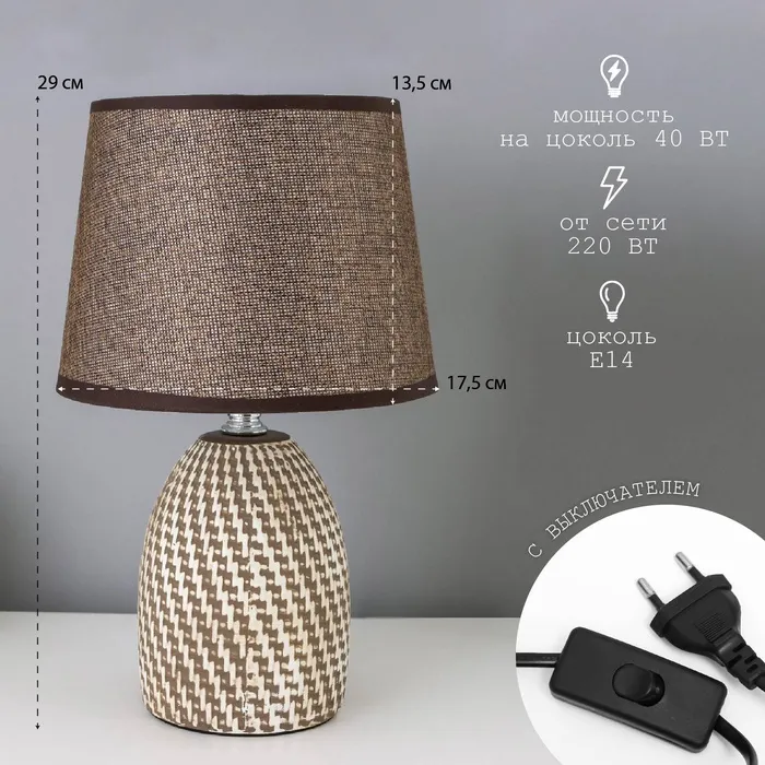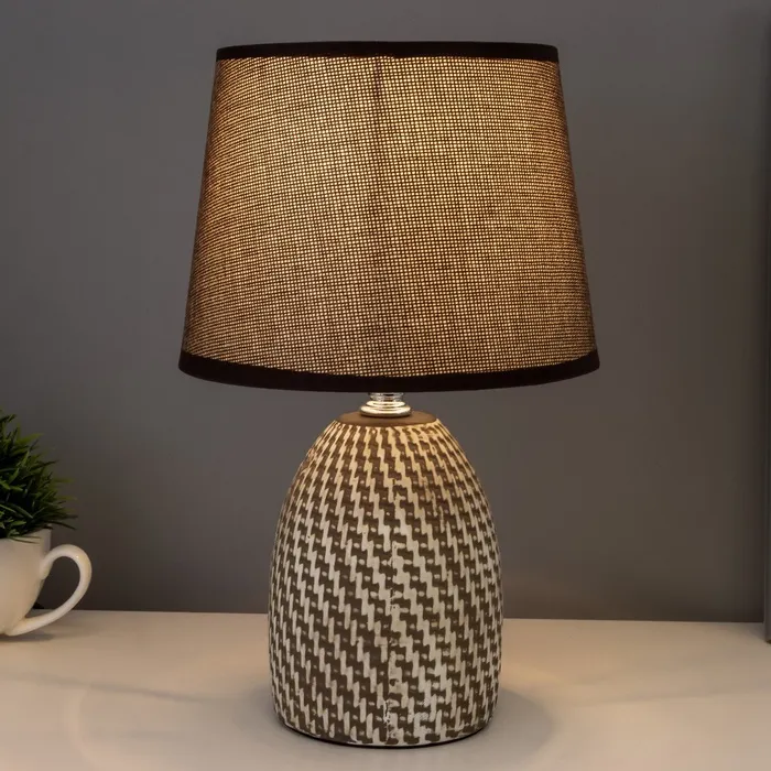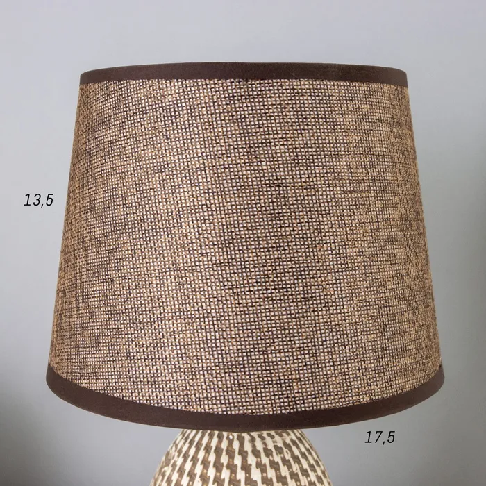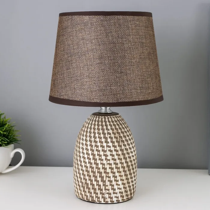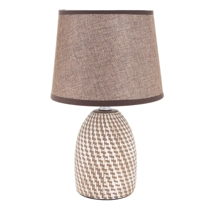 Настольная лампа с абажуром в коричневом цвете добавит уют и стиль в любое помещение. Высота 29 см и керамическое основание создают гармоничное сочетание, а трапециевидный текстильный абажур мягко рассеивает свет, создавая комфортную атмосферу.