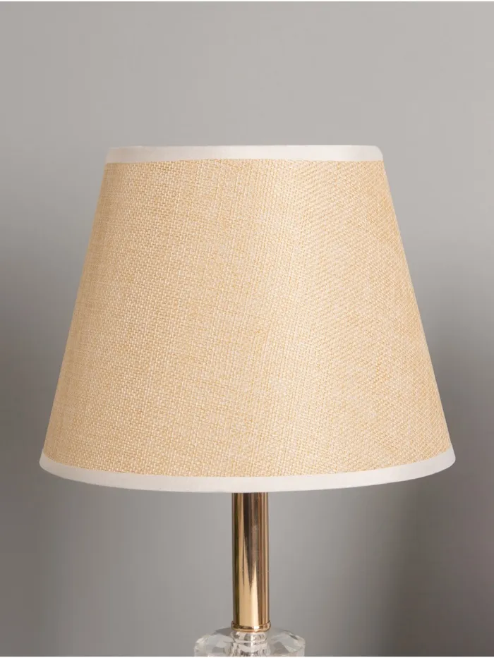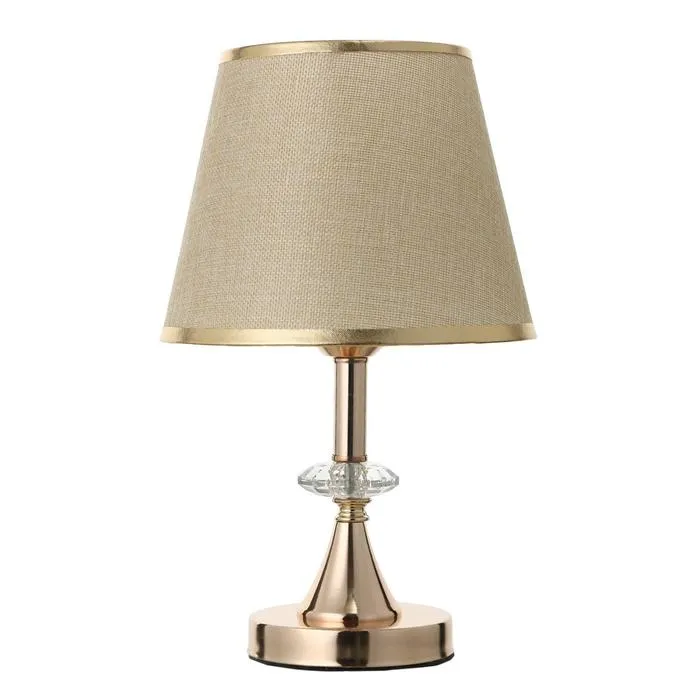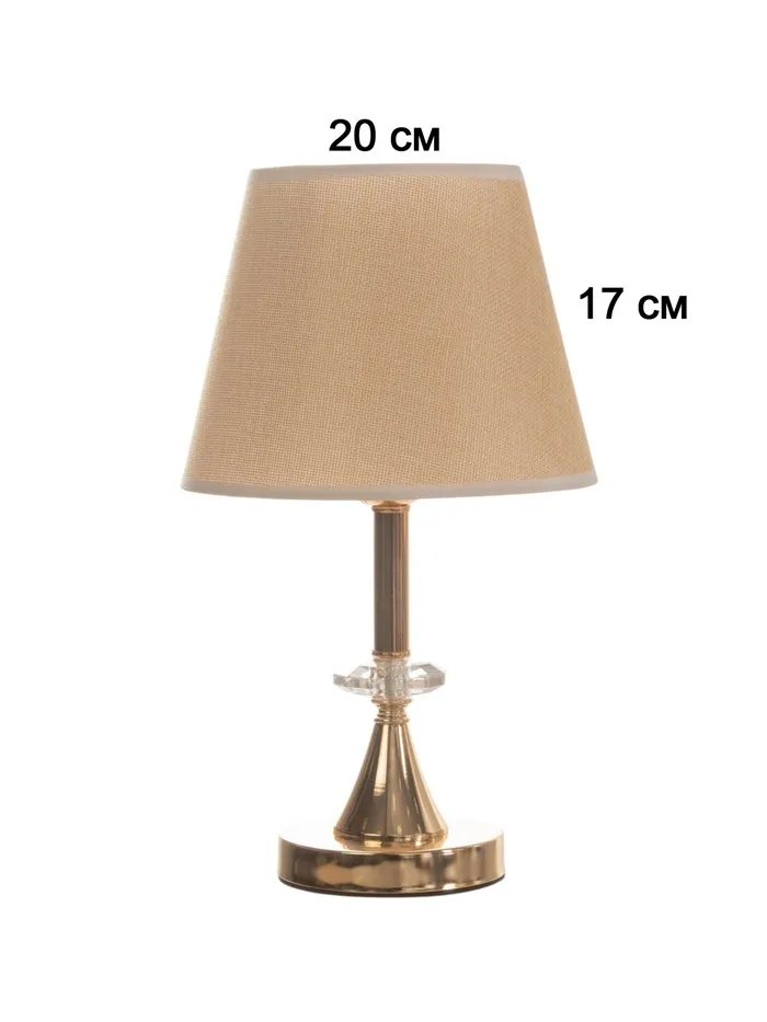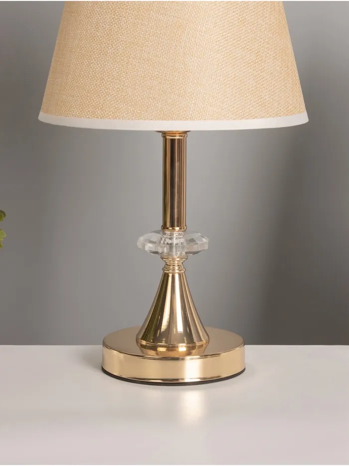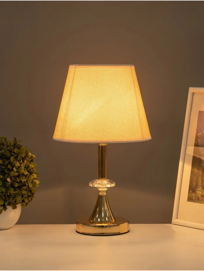 Элегантная настольная лампа с золотым основанием и текстильным абажуром станет отличным дополнением вашего интерьера. С высотой 36 см и размерами 21х21 см, она идеально подходит для создания уютной атмосферы в любом помещении. Трапециевидный абажур в светлых тонах направляет свет вверх, обеспечивая мягкое и комфортное освещение.