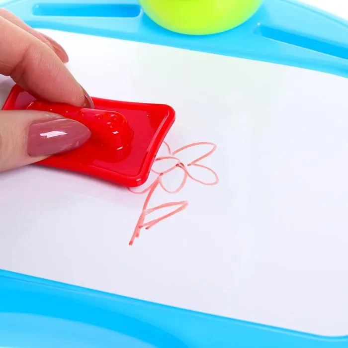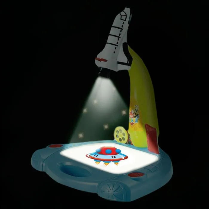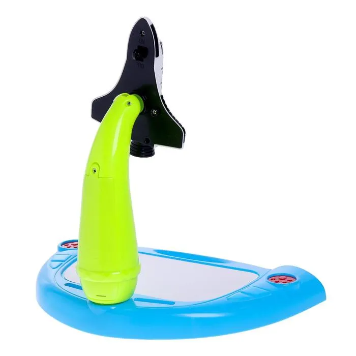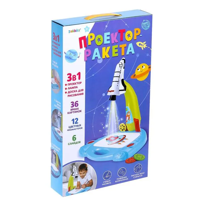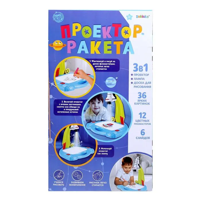 Проектор, выполненный в форме ракеты, — то, что нужно для развития воображения, цветового восприятия и первых навыков рисования маленького художника. Красочные слайды с изображениями познакомят малыша с удивительным миром сказочных персонажей, различными городами и планетами. Достаточно установить слайд с картинками, закрепить лист бумаги и включить проектор, — на листе появится увеличенное изображение, которое можно обводить и раскрашивать.