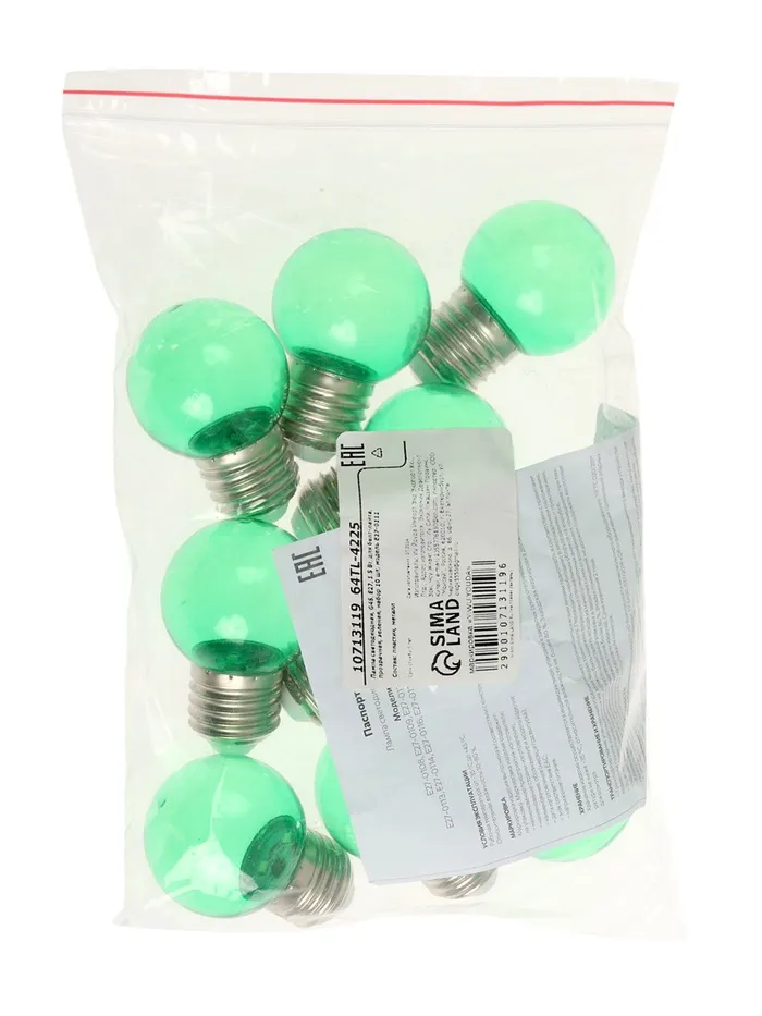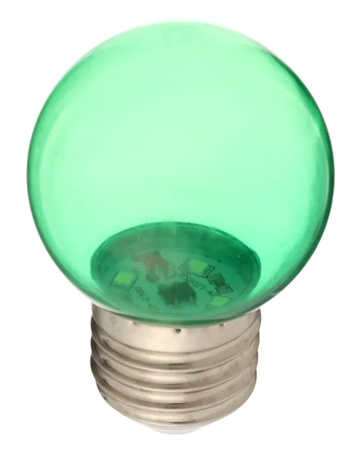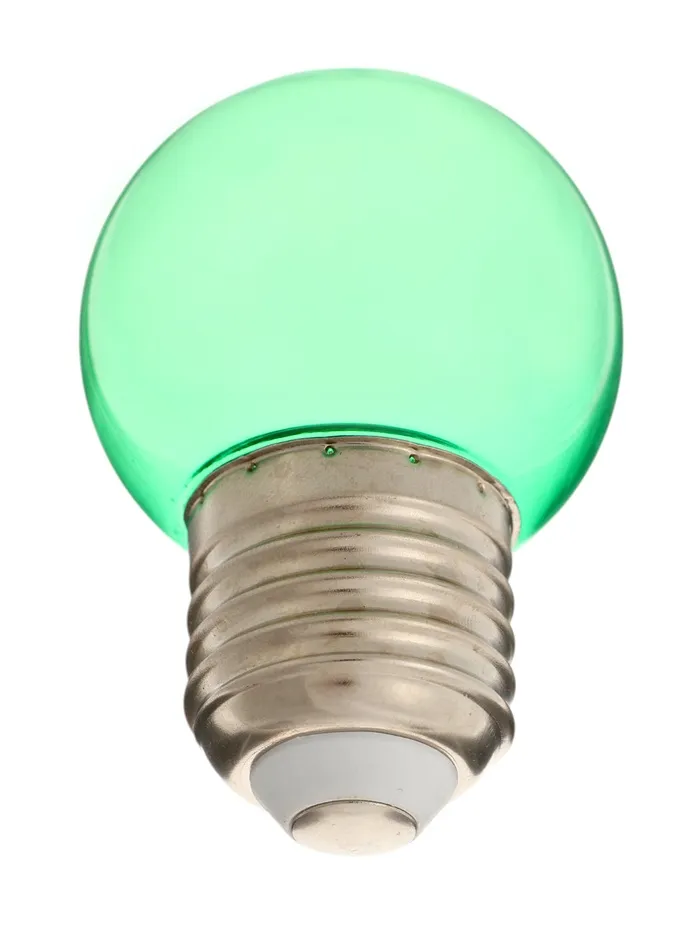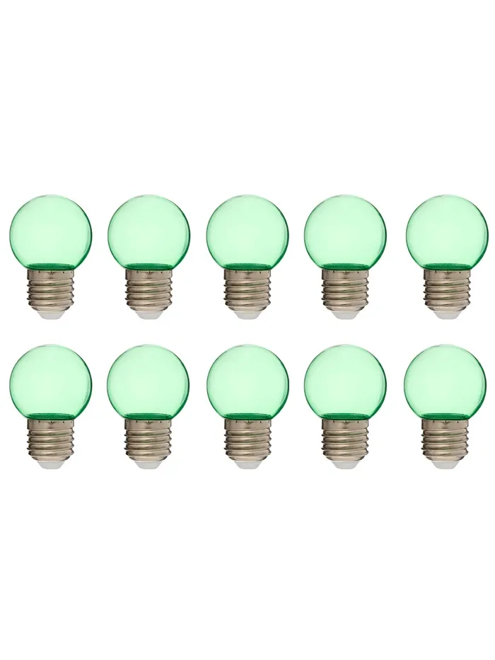 Набор из 10 светодиоидных ламп с цоколем E27 создает ровное зелёное свечение для оборудования световых линий. Прозрачный корпус пропускает максимум света, а компактная форма шара подходит для большинства светильников.