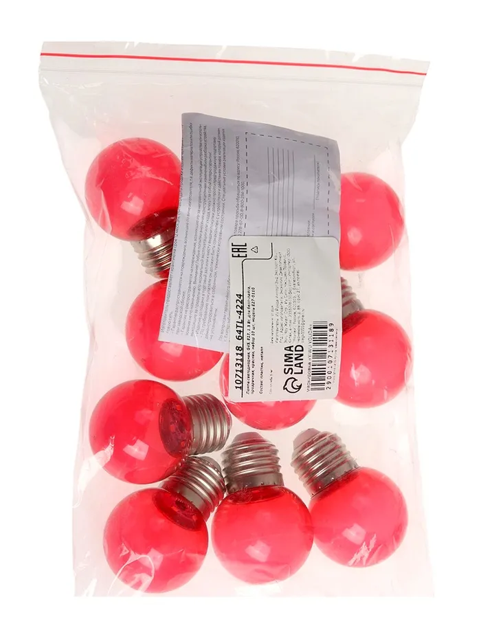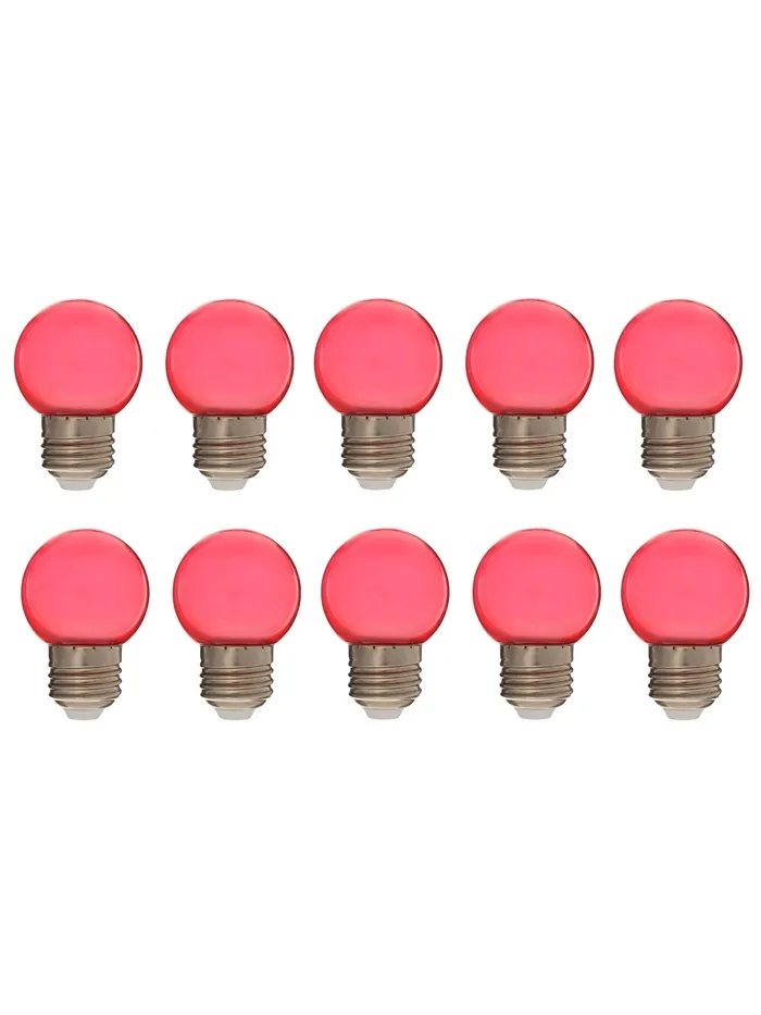 Набор из 10 светодиоидных ламп с цоколем E27 создает ровное красное свечение для оборудования световых линий. Прозрачный корпус пропускает максимум света, а компактная форма шара подходит для большинства светильников.