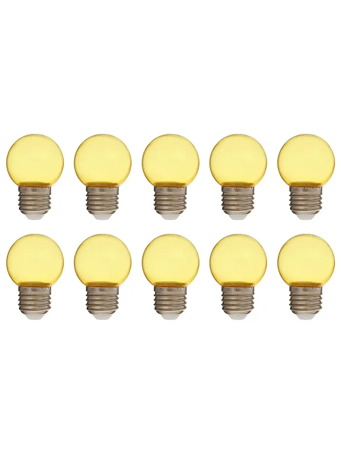 Набор из 10 светодиоидных ламп с цоколем E27 создает ровное жёлтое свечение для оборудования световых линий. Прозрачный корпус пропускает максимум света, а компактная форма шара подходит для большинства светильников.