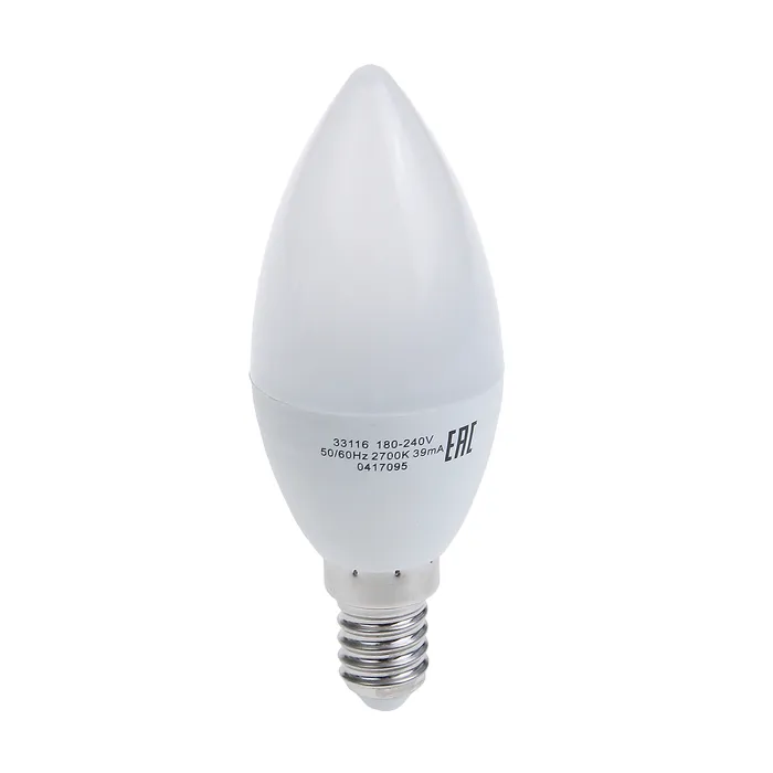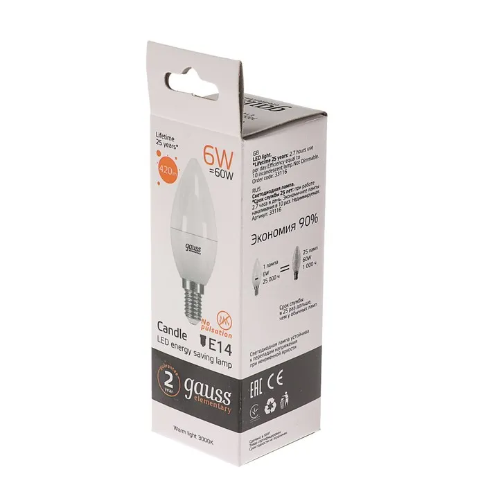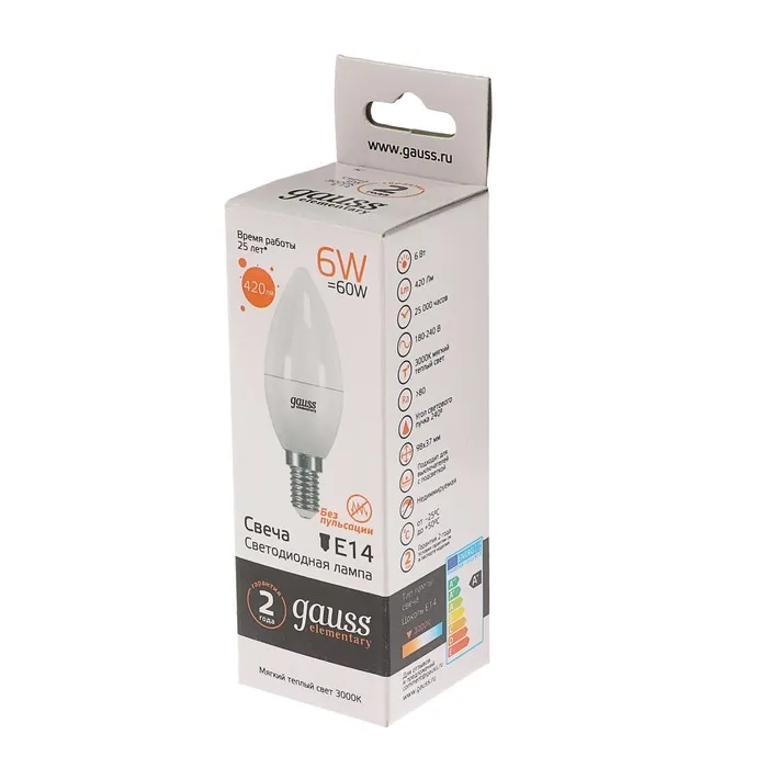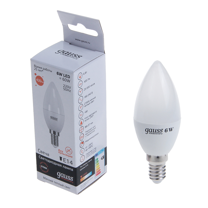 Лампа светодиодная Gauss, Elementary, С37, 6 Вт, E14, 420 Лм, 2700 K, теплый белый — Характеристики