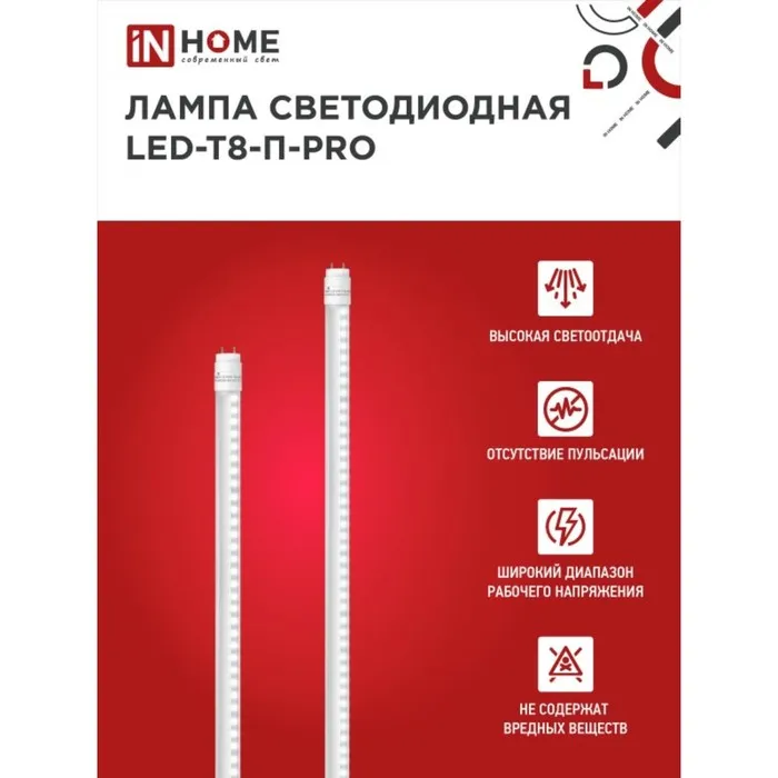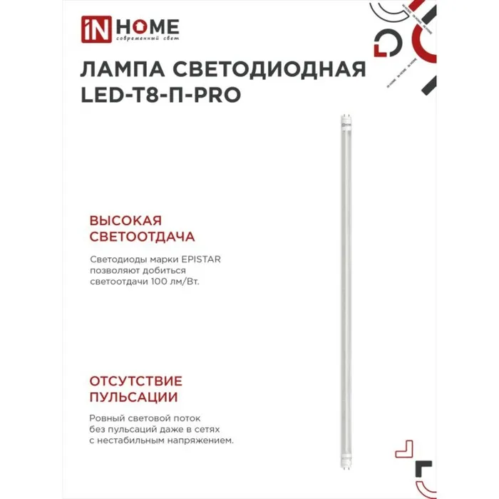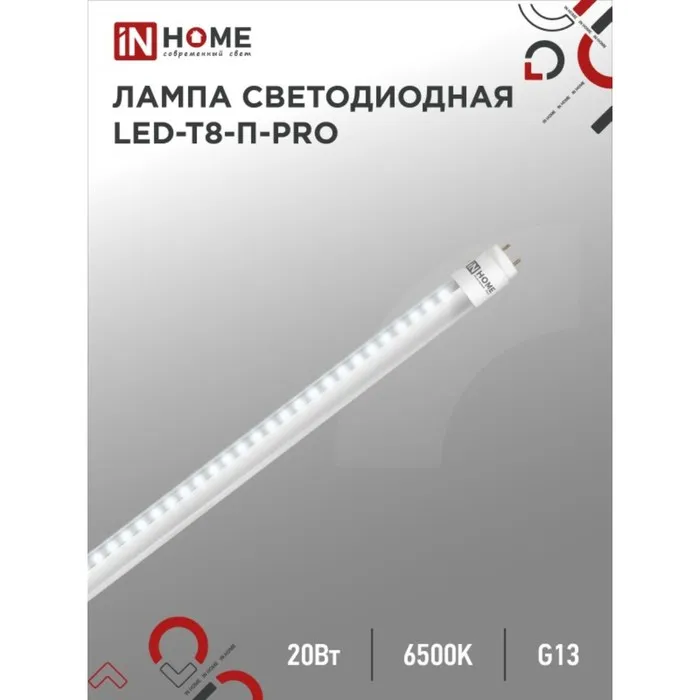 Лампа светодиодная IN HOME, G13, 20 Вт, 1620 Лм, 6500К, 1200 мм, прозрачная, свечение холодное белое — Характеристики