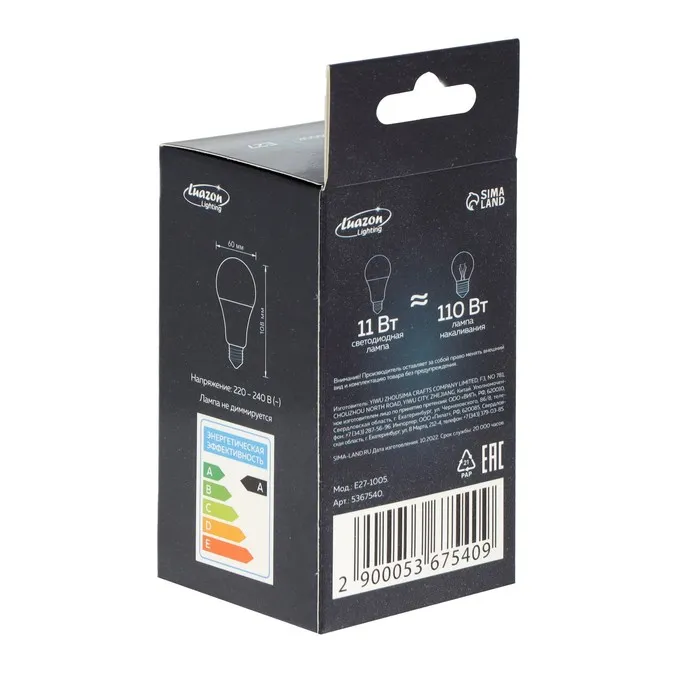 Лампа светодиодная Luazon Lighting, A60, 11 Вт, E27, 990 Лм, 6500 К, холодный белый — Характеристики